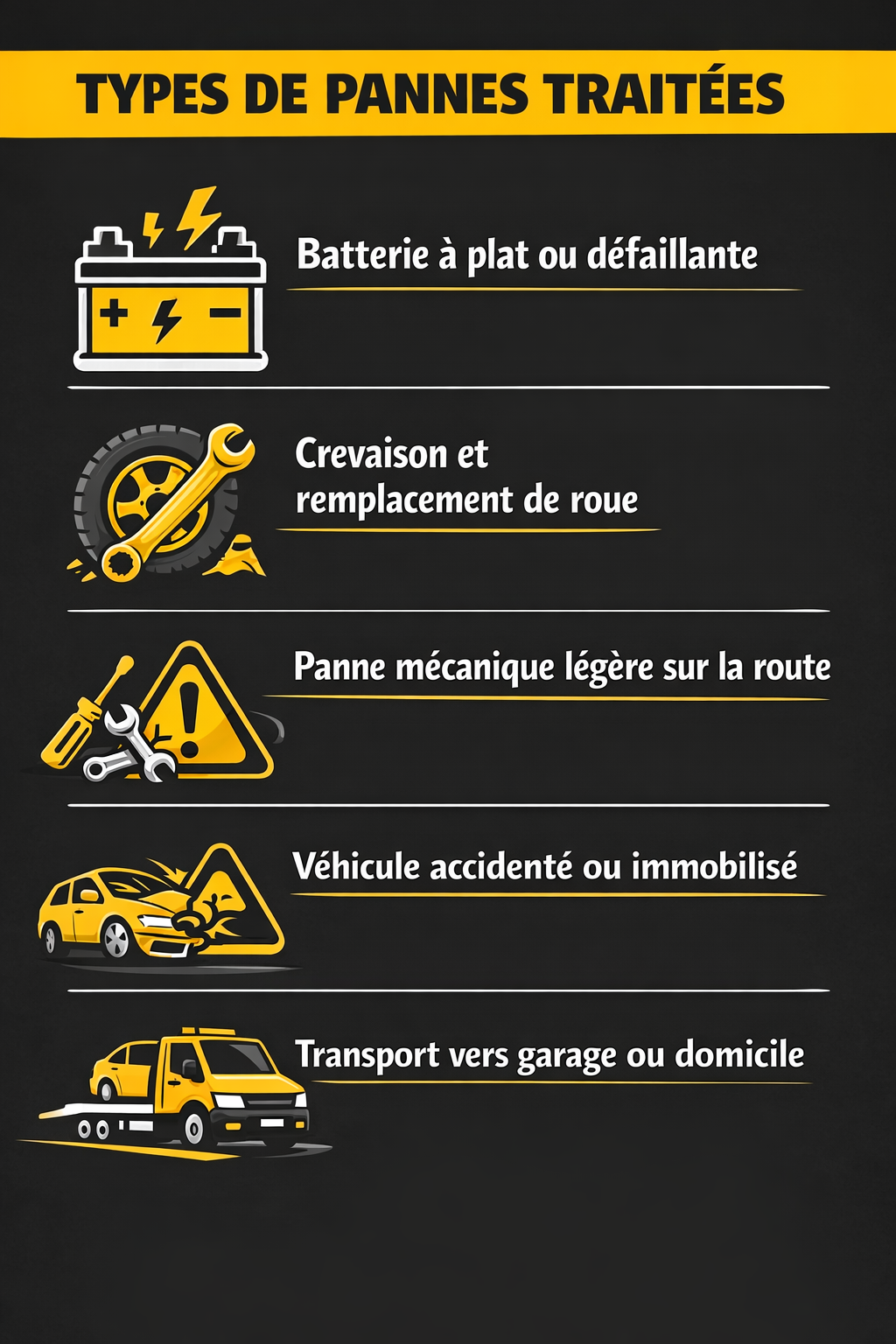 Que ce soit pour un dépannage, un remorquage, un problème de batterie ou changement de pneu, vous recevez un devis clair avant toute intervention. Aucune mauvaise surprise, aucun frais caché.